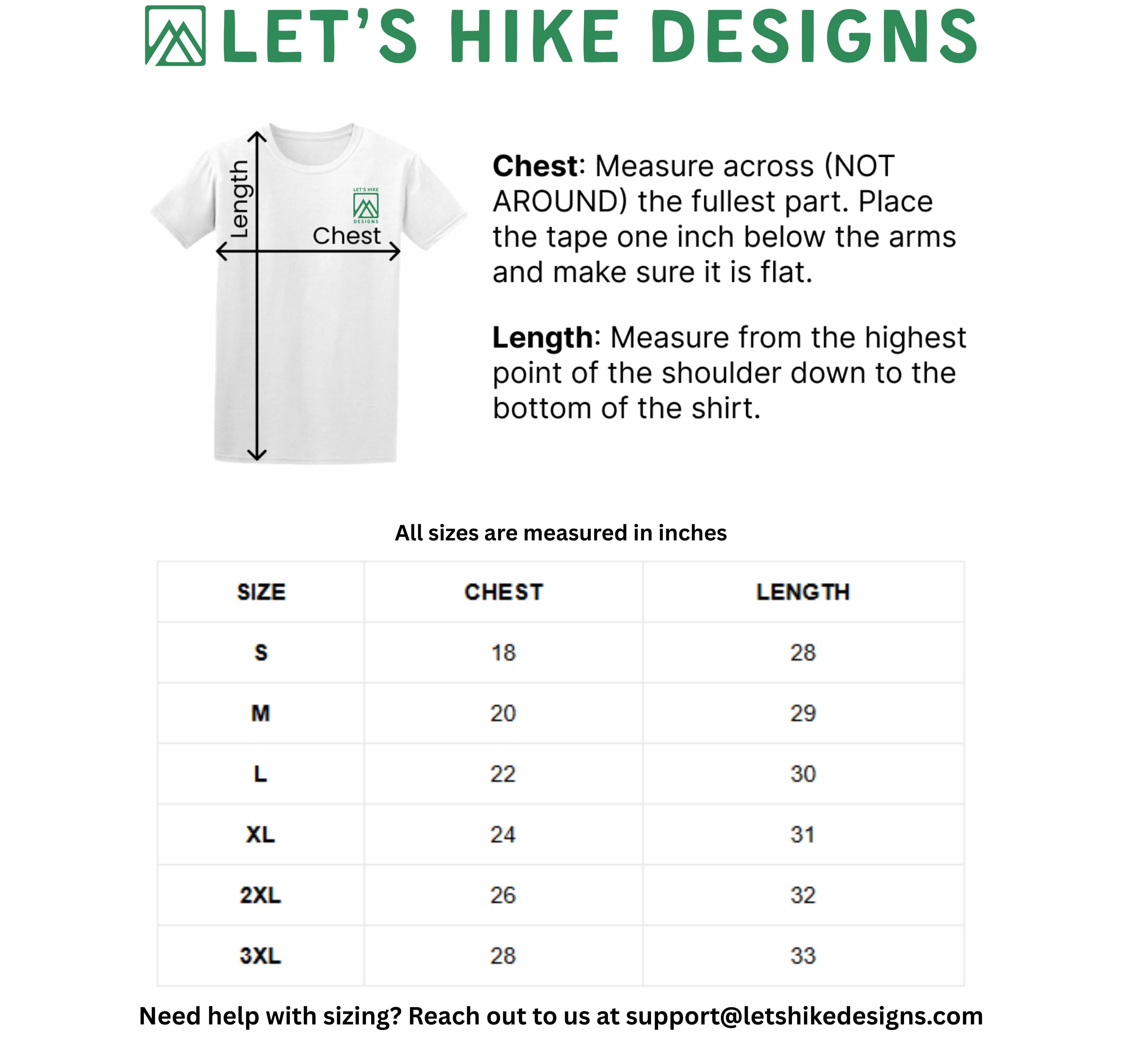 Our tees are unisex and run true to size. Use the size chart on the product page to compare chest/length. For best fit, measure a tee you love. Prefer a looser fit? Size up. Need help? Email support@letshikedesigns.com.